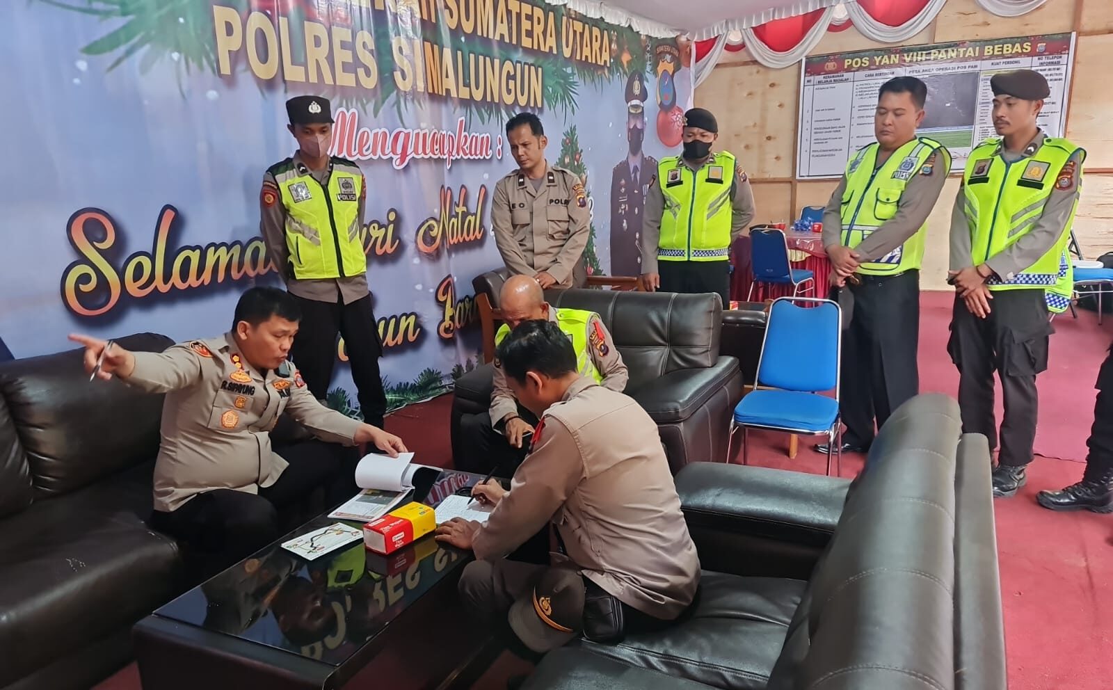 Kapolres Simalungun AKBP Ronald F.C Sipayung, melakukan pengecekan kelengkapan Pos Pengamanan (Pam) Pos I Dolok Simpang Dolok Merangir dan Pos Pelayanan SMK 3 Jalur Lintas Sumatera Utara dan Lintas Siantar-Parapat, Pos Pam V Simpang Sampuran, Pos Yan V RM. Mandailing, Pos Yan VI Simpang Palang, Pos Yan VIII Pantai Bebas dan Pos Yan VI Pagoda/Open Stage Parapat, Jumat (23/12/2022).