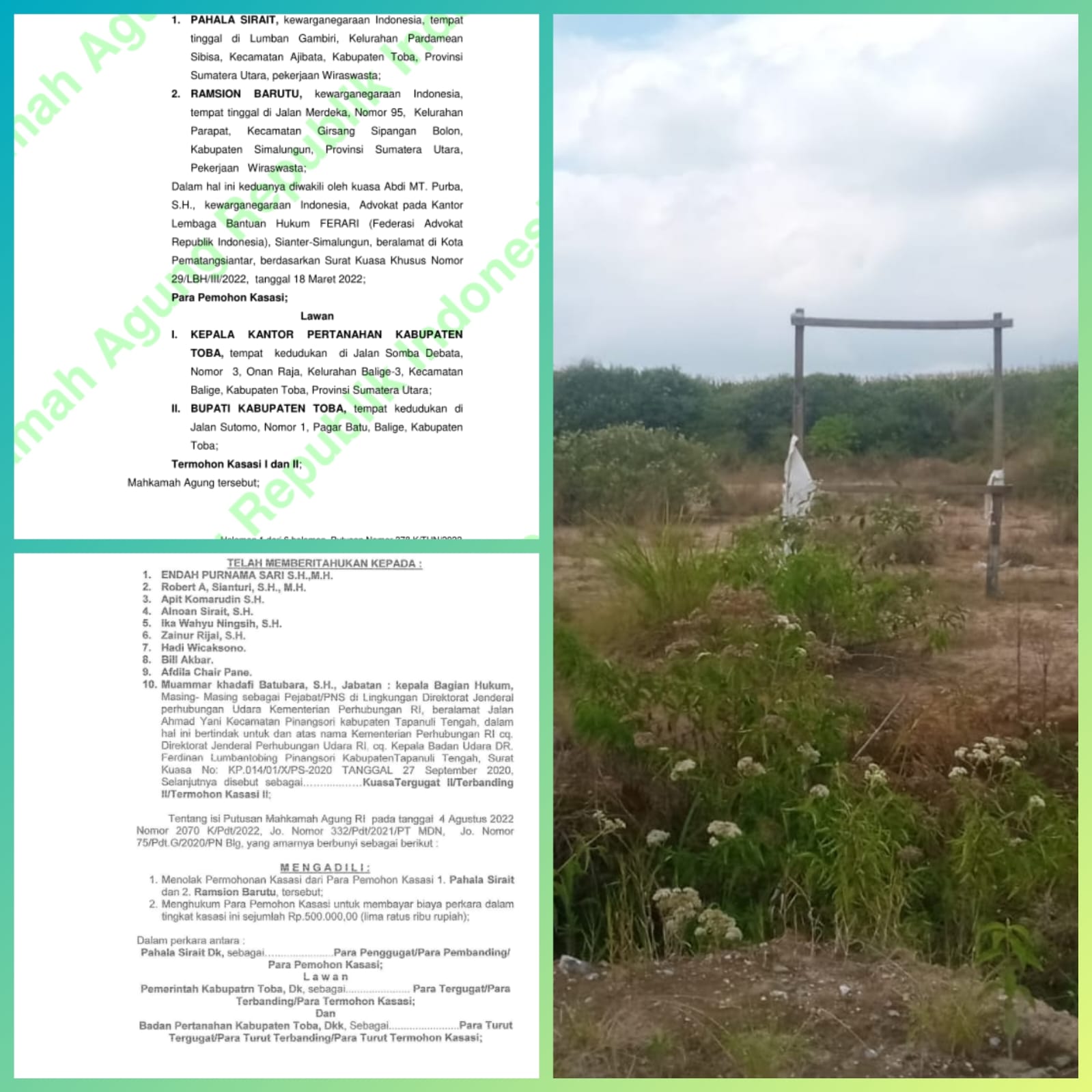 (Lawan): KEPALA KANTOR PERTANAHAN KABUPATEN TOBA, maka sesuai dengan pelaksanaan hukum, sebagaimana yang dimaksud dalam Pasal 30 Undang-Undang Nomor 14 Tahun 1985 tentang Mahkamah Agung sebagaimana telah diubah dengan Undang-Undang Nomor 5 Tahun 2004 dan perubahan kedua dengan Undang-Undang Nomor 3 Tahun 2009