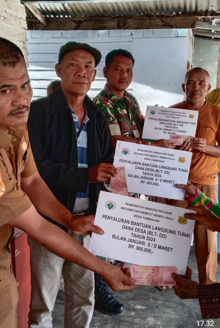 Dalam rangka membantu masyarakat miskin ekstrem di Desa Tambahan, Kecamatan Siempat Nempu Hulu, Kabupaten Dairi, Pemerintah Desa Tambahan bekerja sama dengan Babinsa Koramil 04/Tigalingga, Kodim 0206/Dairi, menyalurkan Bantuan Langsung Tunai Dana Desa (BLT-DD) Tahap I Bulan (Jan, Feb, Mar), Senin (27/5/2024).