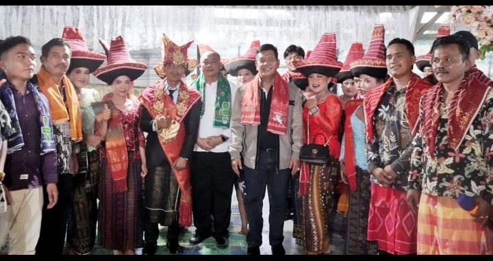 Bupati Simalungun Radiapoh Hasiholan Sinaga bersama wakil ketua DPRD Samrin S. Girsang menghadiri pesta gendang guro-guro aron (pesta budaya kerja tahun) di Nagori Panribuan Jahean, Kecamatan Dolok Silou, Simalungun, Sumut, Jum’at (16/8/2024).