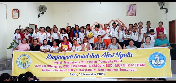 SMP Swasta Katolik Budi Murni 2 Jalan Kapiten Purba II, Mangga, Kecamatan Medan Tuntungan mengadakan kunjungan ke Panti Asuhan SLB-C Karya Tulus Namopecawir Tuntungan dalam aksi sosial dan aksi nyata Projek Penguatan Profil Pelajar Pancasila (P-5), Sabtu (18/11)2023).