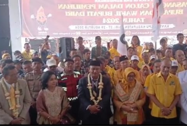 Pasangan bakal calon Bupati dan Wakil Bupati Dairi, Vickner Sinaga dan Wahyu Daniel Sagala, yang diusung oleh Partai Golkar, Perindo, dan PKS dan Partai Gelora, resmi mendaftarkan diri ke Kantor Komisi Pemilihan Umum (KPU) Kabupaten Dairi pada Kamis (29/08/2024). Kedatangan mereka diiringi oleh ratusan pendukung yang memenuhi area KPU, disambut langsung oleh para komisioner KPU dan Bawaslu Kabupaten Dairi.
