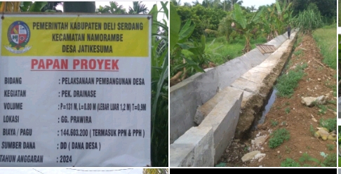 Pembangunan drainase di Gang Prawira, Desa Jatikesuma, Kecamatan Namorambe, Kabupaten Deli Serdang, Provinsi Sumatera Utara yang menelan biaya Rp 144.603.200 diduga tidak sesuai bestek. Baru dua minggu selesai pengerjaan, drainase tersebut sudah ambruk, menimbulkan kekhawatiran di masyarakat terkait kualitas proyek.