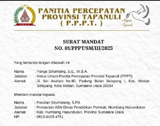 Surat mandat yang diterbitkan pada 13 Maret 2025 tersebut berlaku selama 60 hari dan ditandatangani oleh Ketua Umum PPPT, Yonge Sihombing, S.E., M.B.A., dan Parulian Situmorang, S.Pd. sebagai penerima mandat. Dalam mandat tersebut, Parulian Situmorang akan memimpin POKJA yang terdiri dari pensiunan ASN yang memiliki pengalaman dan pengetahuan yang relevan untuk membantu proses transisi tersebut.