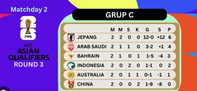 Hingga Matchday 2 Kualifikasi Piala Dunia 2026 Zona Asia Grup C, Timnas Indonesia sementara berada di peringkat keempat dengan perolehan 2 poin dari dua pertandingan. Indonesia mencatat 2 hasil imbang., dengan selisih gol 1-1, setelah mencetak satu gol dan kebobolan 1 gol.