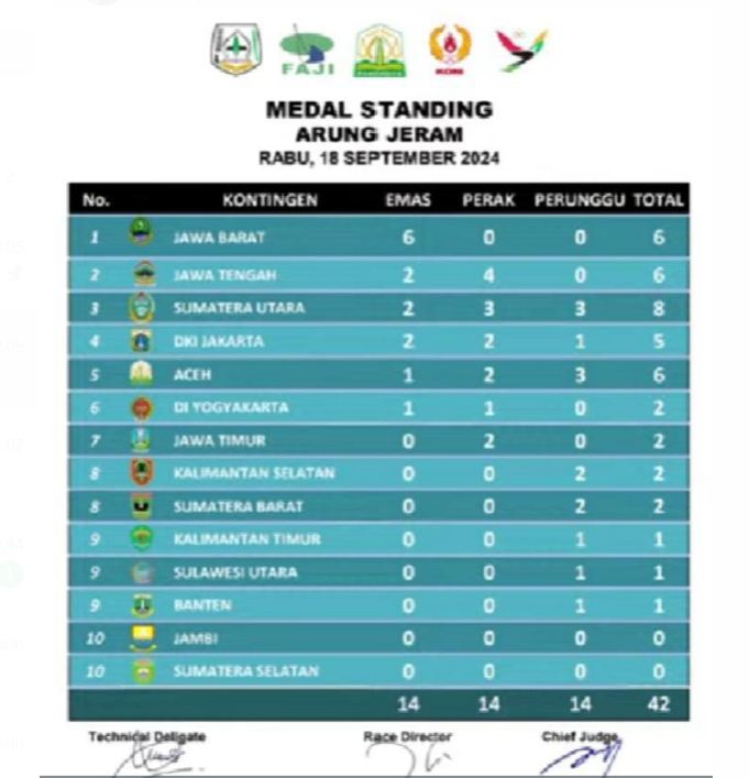 Sumatera Utara meraih prestasi membanggakan dalam ajang Pekan Olahraga Nasional (PON) XXI Aceh-Sumut 2024, dengan cabang olahraga arung jeram menyumbangkan total 8 medali, terdiri dari 2 medali emas, 3 perak, dan 3 perunggu. Prestasi luar biasa ini disambut meriah oleh Pengprov FAJI Sumut dan masyarakat Sumatera Utara dalam acara penyambutan yang berlangsung di Sekretariat FAJI Sumut, Jalan Bahagia By Pass Medan, pada Jumat (20/9/2024).
