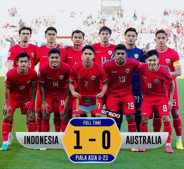 Timnas Indonesia berhasil taklukkan Australia pada Piala Asia U-23 Tahun 2024 setelah tendangan Komang Teguh pada menit ke-45 membobol gawang Australia di Abdullah bin Nasser bin Khalifa Stadium, Kamis (18/4/2024) malam WIB