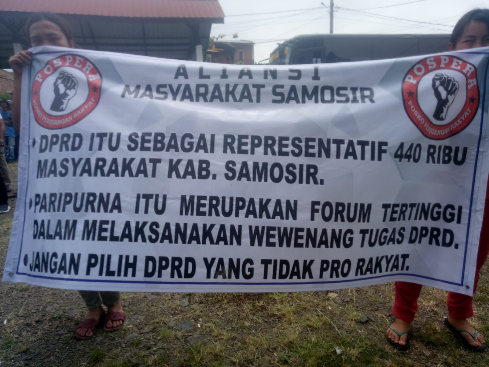 Tampak para pendemo itu membawa spanduk yang dibentangkan oleh pendemo itu ada dituliskan ” ALIANSI MASYARAKAT SAMOSIR, DPRD ITU SEBAGAI REPRESENTATIF 440 RIBU MASYARAKAT KAB. SAMOSIR, PARIPURNA ITU MERUPAKAN FORUM TERTINGGI MELAKSANAKAN WEWENANG TUGAS DPRD, JANGAN PILIH DPRD YANG TIDAK PRO RAKYAT”.