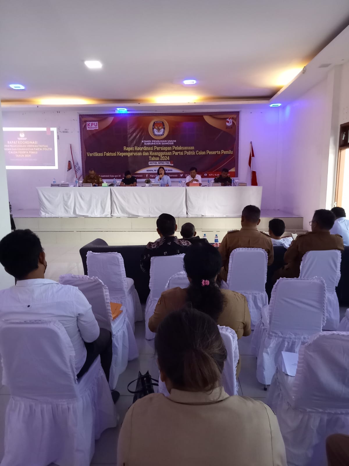 Komisi Pemilihan Umum (KPU) Kabupaten Samosir menggelar rapat koordinasi persiapan pelaksanaan verifikasi faktual (Verfak) kepengurusan dan keanggotaan partai politik calon peserta Pemilu 2024, Senin (10/10/2022) di Aula Hotel Sitiotio, Kelurahan Siogungogung, Kecamatan Pangururan, Samosir.