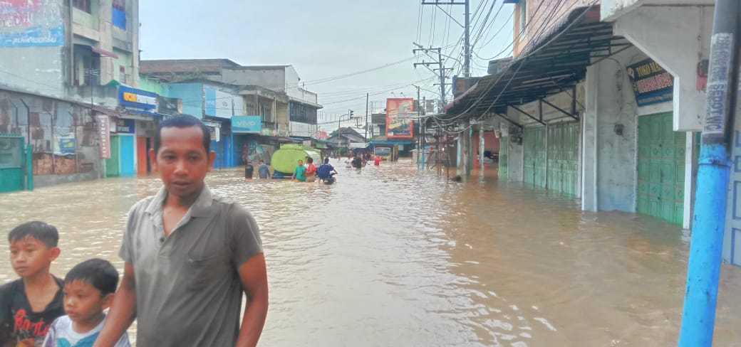 Curah Hujan satu malam aliran sungai Deli meluap Medan Utara Banjir, aktifitas lumpuh total, ketingian air di jalan Kol.Yossudarso di persimpangan Titipapan satu meter para pekerja yang niatnya mau kerja terpaksa Absen.